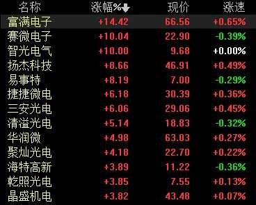 摘要: 6月4日,第三代半導體走強,富滿電子(300671)漲超14%,賽微電子(300456)、智光電氣(002169)漲停,華潤微、三安光電(600703)等紛紛跟漲。