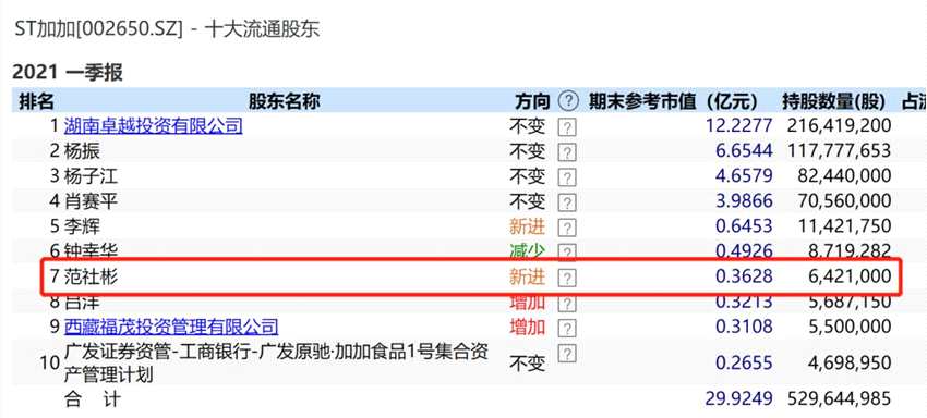 數(shù)據(jù)顯示,一季度,范社彬新進(jìn)買入642.1萬股ST加加,持有市值3628萬元。