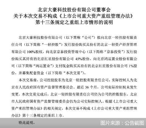 十年前謀求上市未果的紅星二鍋頭,最終或許只能以曲線救國的方式與資本市場親密接觸。6月6日,北京商報記者就紅星股份與大豪科技(603025)并購最新進展采訪紅星二鍋頭內部人士。據(jù)悉,北京大豪科技股份有限公司(以下簡稱“大豪科技”)發(fā)布公告稱,公司擬通過發(fā)行股份購買北京一輕資產經營管理有限公司(以下簡稱“一輕資產管理公司”)股權、北京京泰投資管理中心(以下簡稱“京泰投資”)所持有的北京紅星股份有限公司股份,通過支付現(xiàn)金方式購買?北京鴻運置業(yè)股份有限公司持有的北京紅星股份有限公司1%股份。