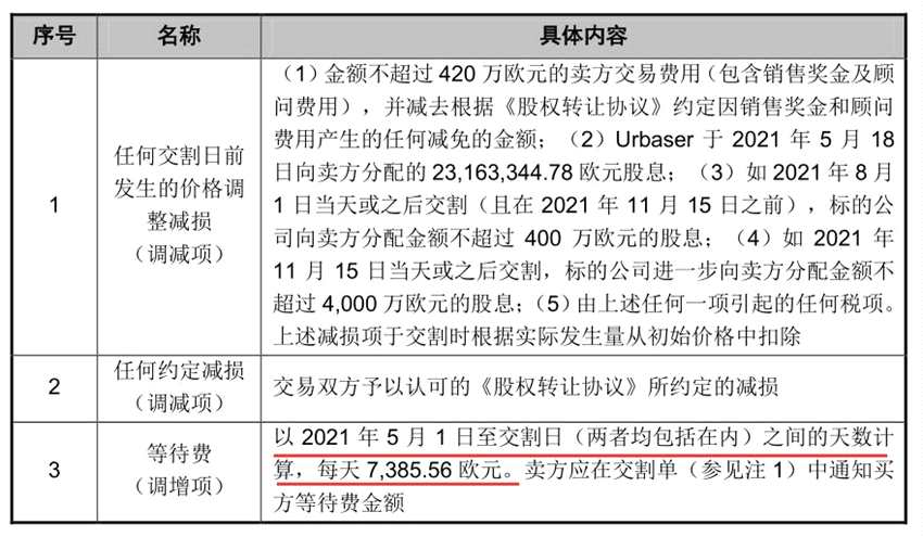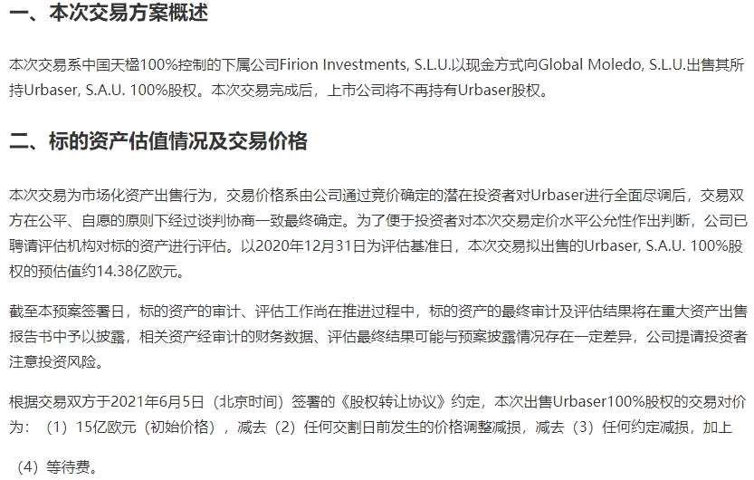 根據(jù)交易雙方于6月5日簽署的《股權(quán)轉(zhuǎn)讓協(xié)議》約定,本次出售Urbaser100%股權(quán)的交易對(duì)價(jià)為:15億歐元(初始價(jià)格),減去任何交割日前發(fā)生的價(jià)格調(diào)整減損,減去任何約定減損,加上等待費(fèi)。