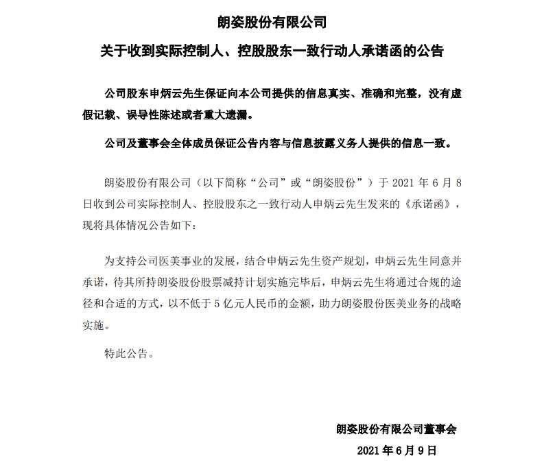 當(dāng)天,朗姿股份還表示于6月8日收到申炳云發(fā)來(lái)的《承諾函》,引來(lái)投資者的關(guān)注?!冻兄Z函》顯示,為支持公司醫(yī)美事業(yè)的發(fā)展,結(jié)合資產(chǎn)規(guī)劃,申炳云同意并承諾,待其所持朗姿股份股票減持計(jì)劃實(shí)施完畢后,將通過(guò)合規(guī)的途徑和合適的方式,以不低于5億元的金額,助力朗姿股份醫(yī)美業(yè)務(wù)的戰(zhàn)略實(shí)施。