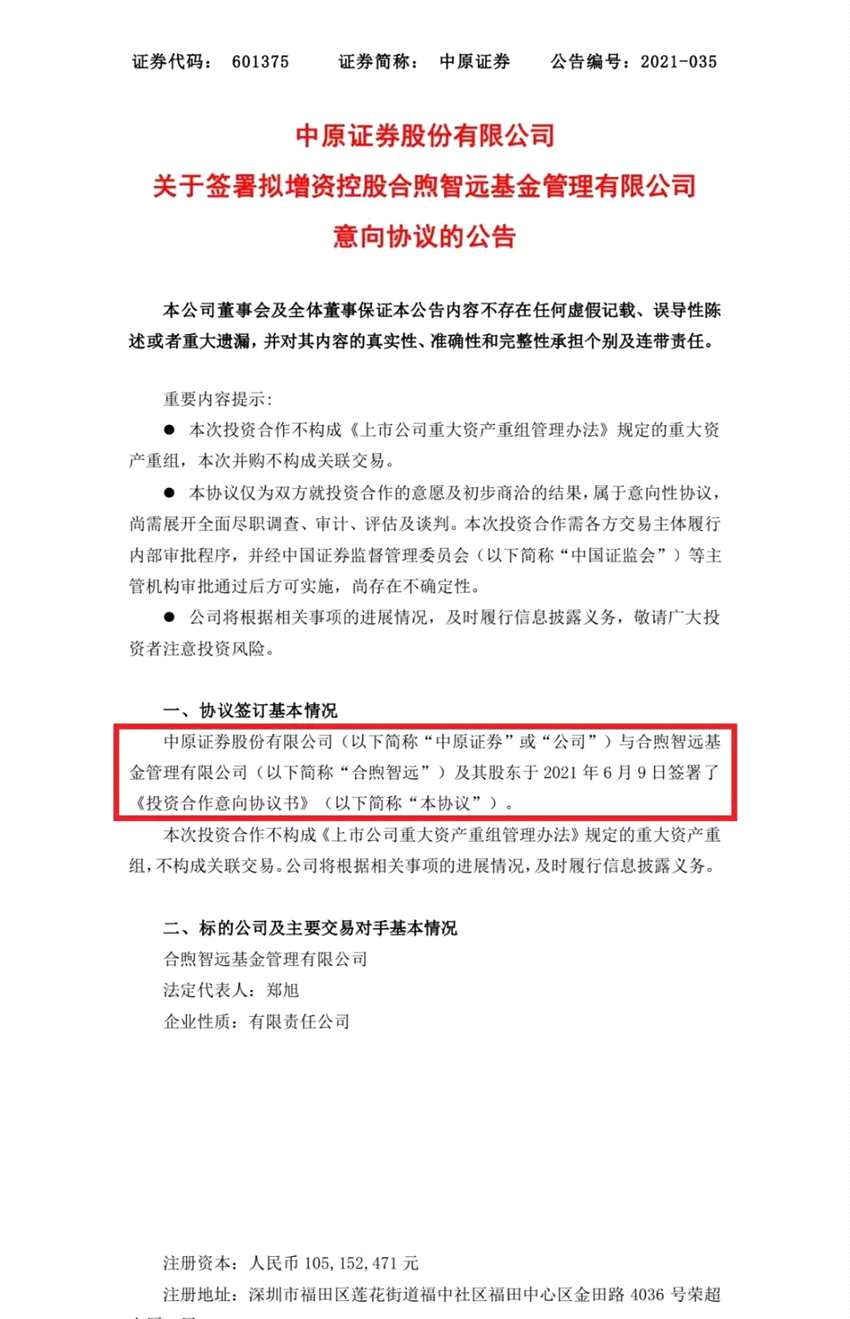 中原證券發(fā)布《關(guān)于簽署擬增資控股合煦智遠(yuǎn)基金管理有限公司意向協(xié)議的公告》,公告中稱,中原證券與合煦智遠(yuǎn)基金管理有限公司及其股東于2021年6月9日簽署了《投資合作意向協(xié)議書》,中原證券有意向以增資等方式成為合煦智遠(yuǎn)的控股股東,擬持有合煦智遠(yuǎn)50%以上的股權(quán)。