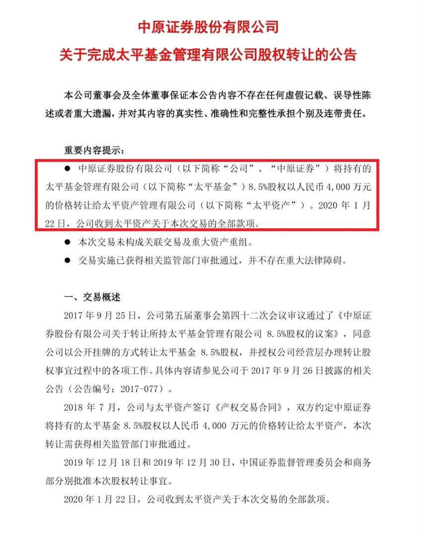 2019年年末,證監(jiān)會(huì)下發(fā)《關(guān)于核準(zhǔn)太平基金管理有限公司變更股權(quán)的批復(fù)》,核準(zhǔn)中原證券股份有限公司將其持有的太平基金8.5%股權(quán)轉(zhuǎn)讓給太平資產(chǎn)管理有限公司,2020年初該筆股權(quán)變更獲太平基金股東會(huì)決議通過,中原證券最終完全退出,不再持有太平基金股權(quán)。