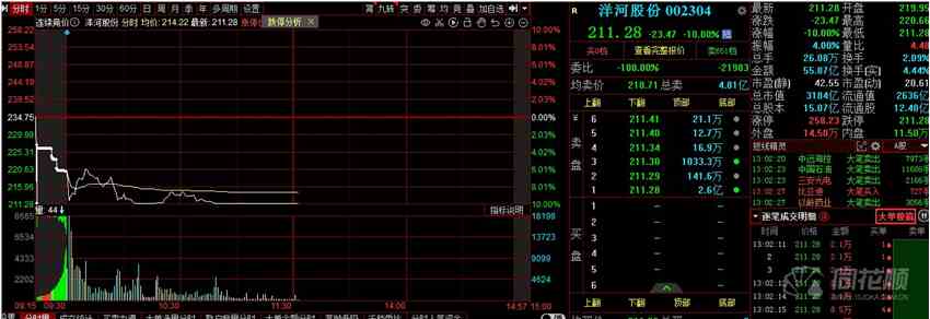 今日,洋河股份低開低走,截至發(fā)稿,股票跌停,報價211.28元,封單金額超2.6億元。