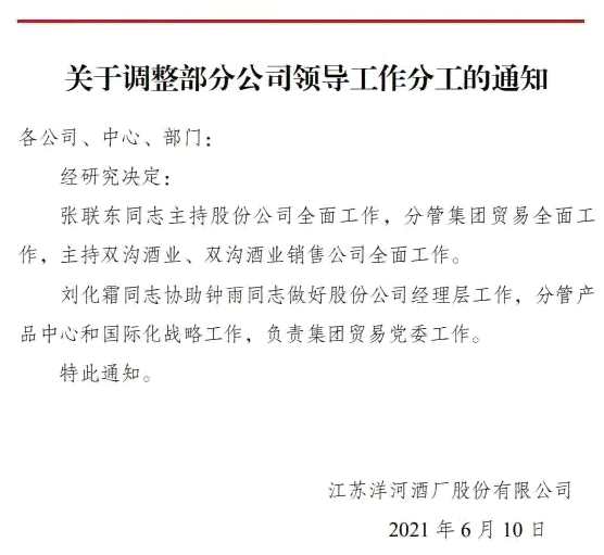 6月11日,根據(jù)消息,昨日晚間洋河股份(002304)發(fā)布《關于調(diào)整部分公司領導工作分工的通知》,表示經(jīng)研究決定:張聯(lián)東同志主持股份公司全面工作,分管集團貿(mào)易全面工作,主持雙溝酒業(yè)、雙溝酒業(yè)銷售公司全面工作。