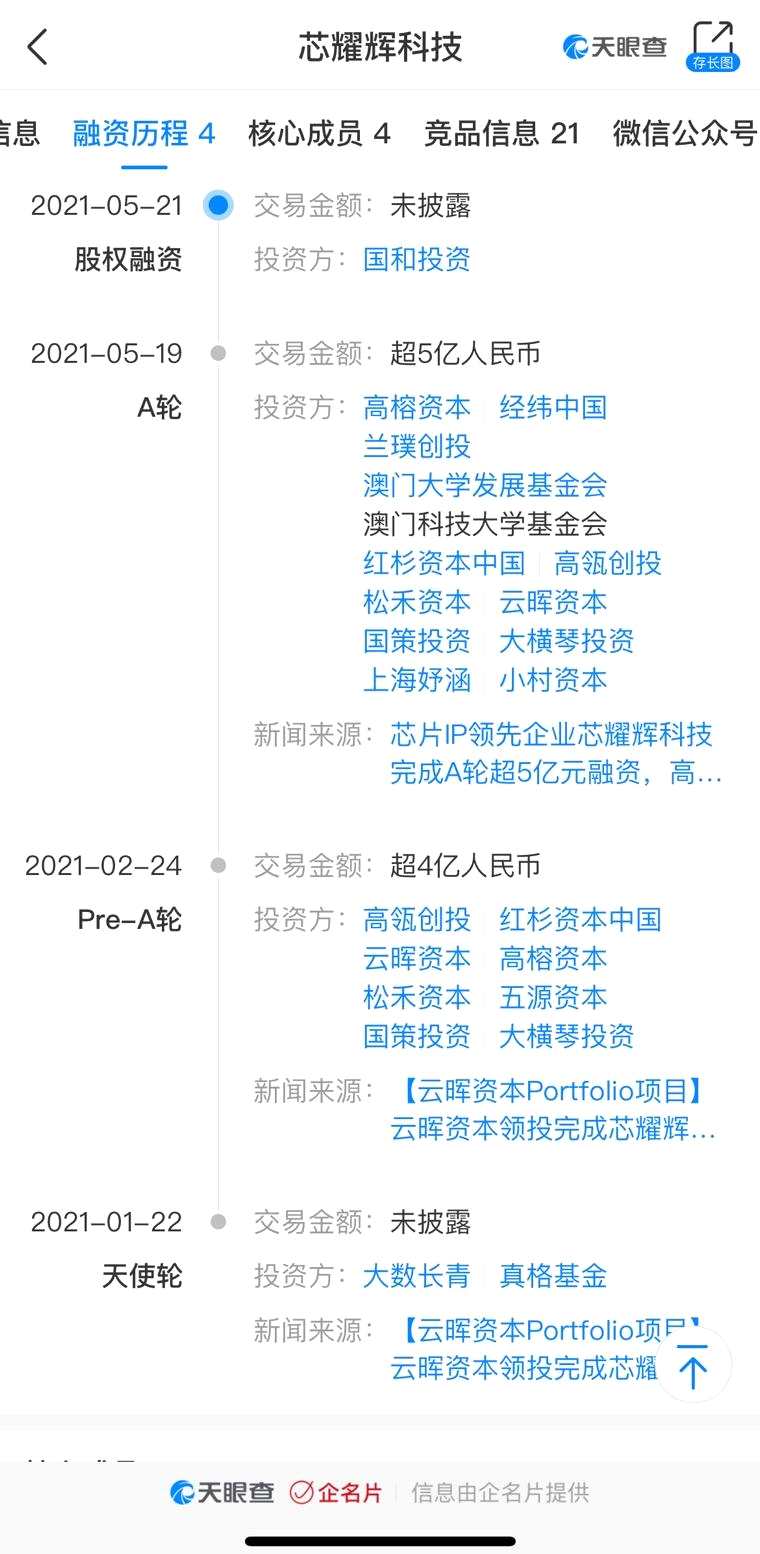 天眼查數(shù)據(jù)顯示,芯耀輝科技成立于2020年6月11日,注冊(cè)資本8540萬元,雖然成立剛滿一年,但其已經(jīng)歷4輪融資。