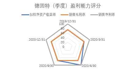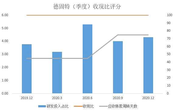 另外,德固特公司研發(fā)投入費(fèi)用并不占優(yōu),基本評(píng)分為45分值。從2019年Q4研發(fā)投入占營(yíng)業(yè)收入比重3.77到2020年Q2、Q4季度占比5.29、4.32逐年略有提高。