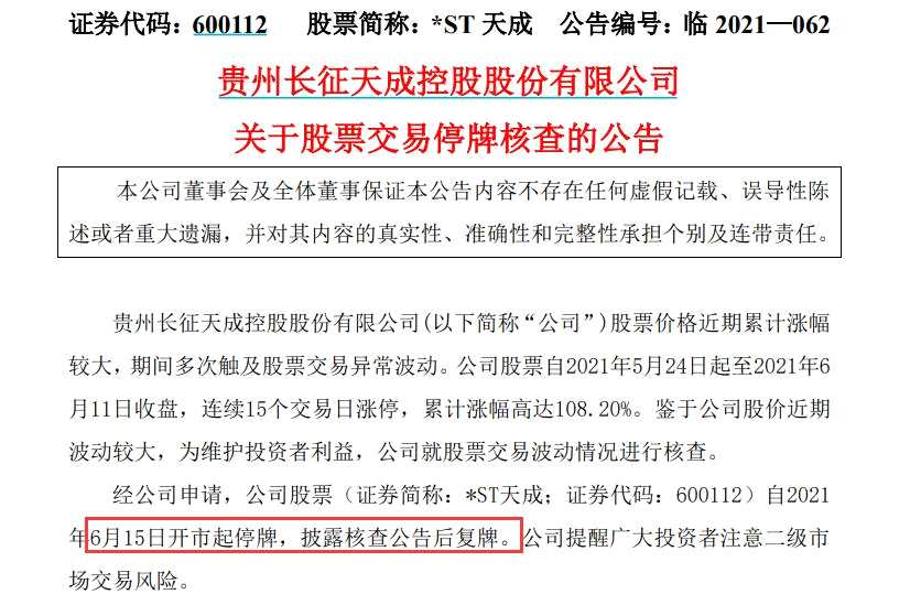*ST天成表示,鑒于公司股價近期波動較大,為維護投資者利益,公司就股票交易波動情況進行核查。公司6月15日開市起停牌。