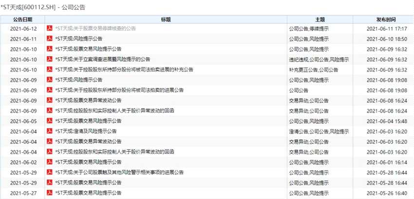 其中,6月3日,*ST天成發(fā)布澄清及風險提示公告,對公司“酒企借殼”相關(guān)傳聞做出說明。
