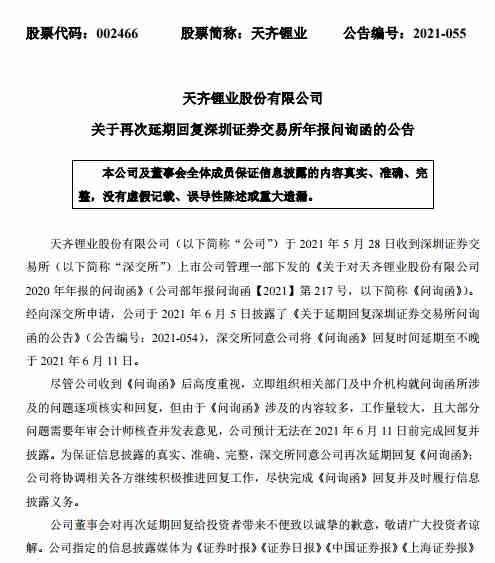 值得注意的是,天齊鋰業(yè)于5月28日收到年報問詢函,6月5日第一次延期回復(fù)問詢函,但6月11日仍無法按時回復(fù)問詢函,今日再度發(fā)布公告延期回復(fù)問詢函。公告內(nèi)容如下: