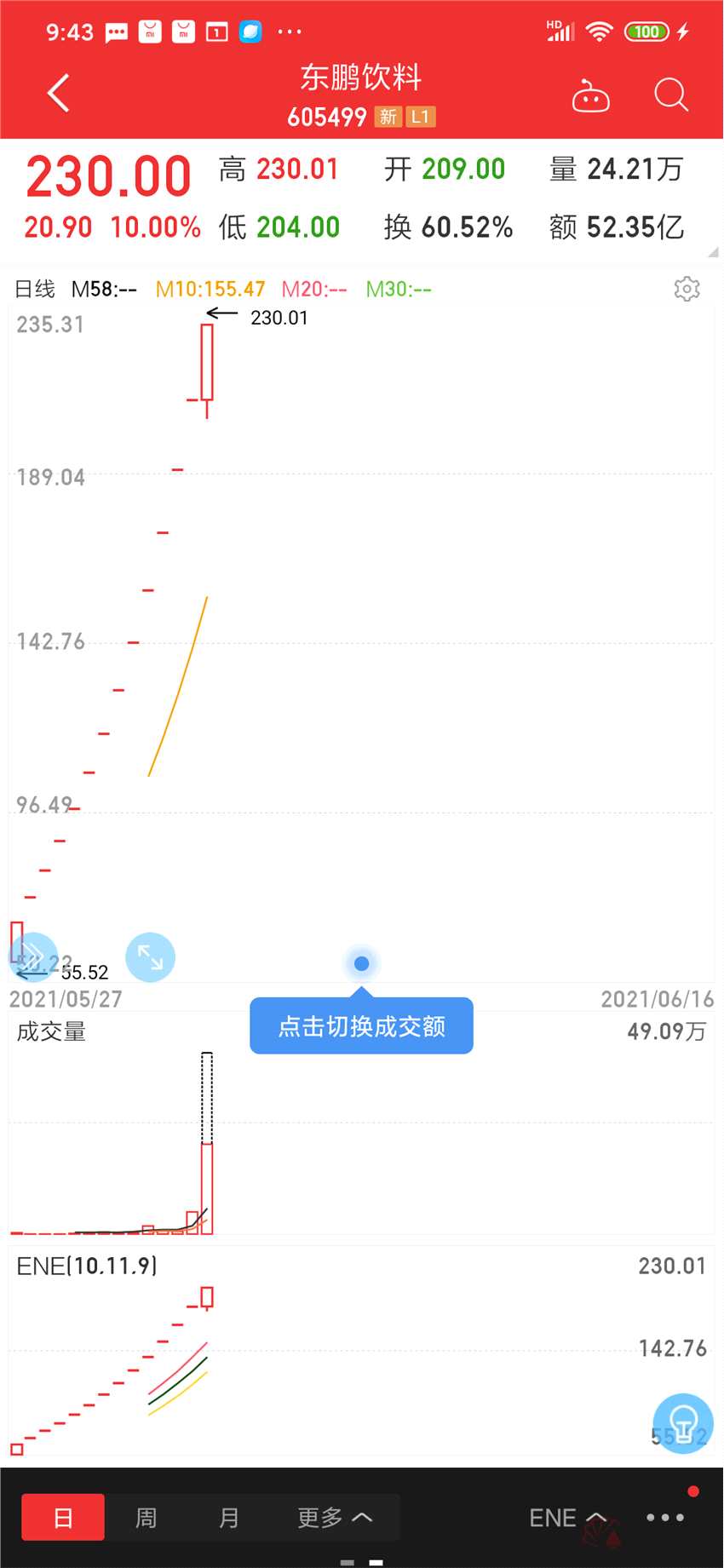 5月27日上市以來,東鵬飲料已經(jīng)連續(xù)收獲13個(gè)一字板,股價(jià)從46.27元一路飆升至209.1元,市值最新達(dá)836億元,中一簽賺超16萬元,成為今年主板第一“肉簽”。