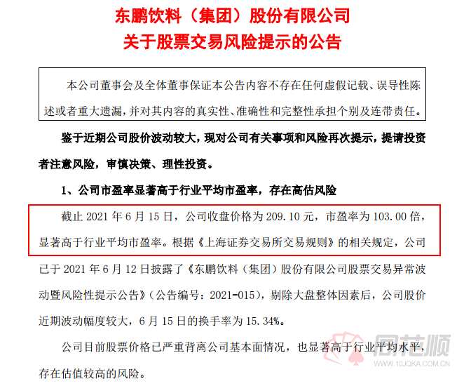 6月15日晚間,市場人氣股東鵬飲料(605499)發(fā)布交易風(fēng)險(xiǎn)提示,公告稱公司當(dāng)前市盈率為103倍,顯著高于行業(yè)平均市盈率。