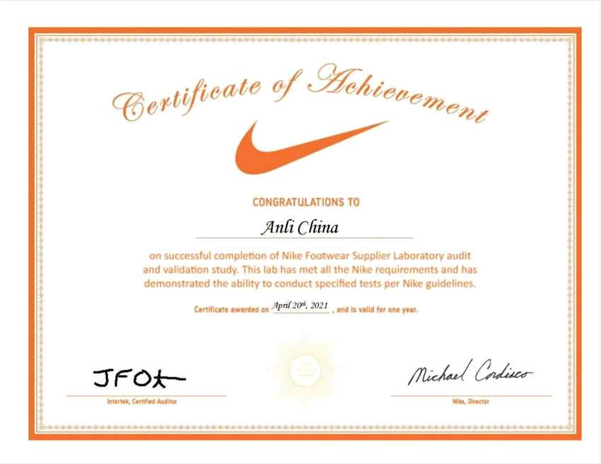 為了滿足美國耐克鞋用材料檢測需求,2020年以來,美國耐克授權國際權威的第三方檢測機構開展耐克實驗室認證工作。經過安利的努力付出與認真改進,審核人員對安利股份實驗室軟硬件、人員素養(yǎng)和檢測能力給予充分肯定,表示安利股份綜合實力位于美國耐克供應商系統(tǒng)前列。