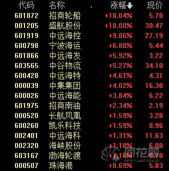 6月17日,航運(yùn)概念大幅拉升,截至發(fā)稿,招商輪船(601872)、盛航股份(001205)觸及漲停,中遠(yuǎn)??兀?01919)大漲9.82%,寧波海運(yùn)(600798)、中遠(yuǎn)海發(fā)(601866)、中谷物流(603565)等漲超5%,【中遠(yuǎn)海特(600428)、股吧】(600428)、中集集團(tuán)(000039)等漲。