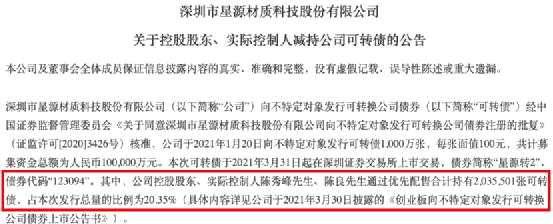 2019年8月以來,星源材質(zhì)控股股東已多次減持。公司實(shí)控人陳秀峰、陳良兄弟通過減持等方式,將持股比例由2019年一季度的31.78%降至今年一季度末的20.35%。今年4月1日公告稱,陳秀峰、陳良擬將持有的“星源轉(zhuǎn)2”可轉(zhuǎn)債203.55萬張“清倉”減持,占發(fā)行總量的20.35%。