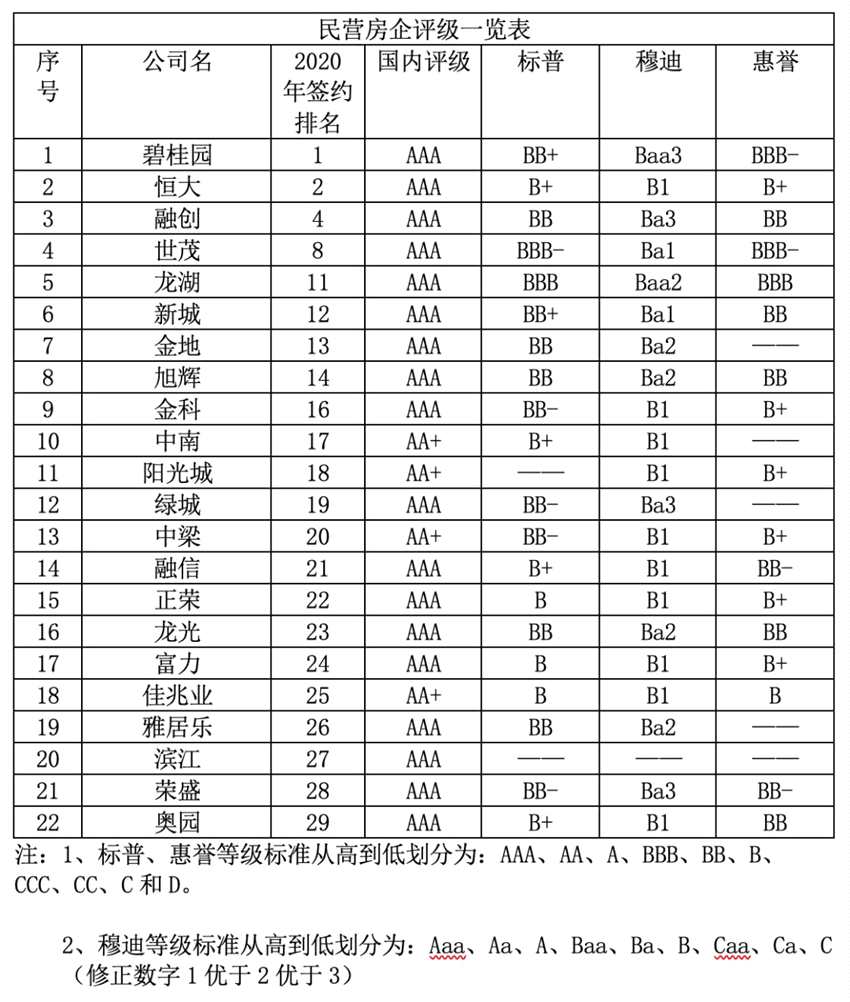 在標(biāo)普、穆迪、惠譽(yù)的評級中,能同時達(dá)到BB-、Ba3、BB-以上評價的TOP30中的民營房企,只有碧桂園、融創(chuàng)、世茂、龍湖、新城、旭輝、龍光、榮盛發(fā)展(002146)等8家。可以說,他們是國際信用評級機(jī)構(gòu)眼中的靠譜房企。