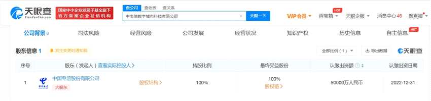 天眼查App顯示,6月18日,中電信數(shù)字城市科技有限公司成立,該公司由中國電信股份有限公司100%控股,注冊地址在中國(河北)自由貿(mào)易試驗區(qū)雄安片區(qū),法定代表人為趙洪勛,注冊資本9億人民幣。