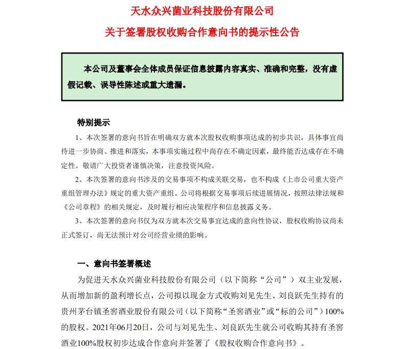 值得一提的是,根據眾興菌業(yè)在公告中的說法,截至目前,雙方僅簽訂了意向書,尚未簽署正式股權轉讓協(xié)議,收購事項仍存在不確定性,尚無法預計對公司經營業(yè)績的影響。