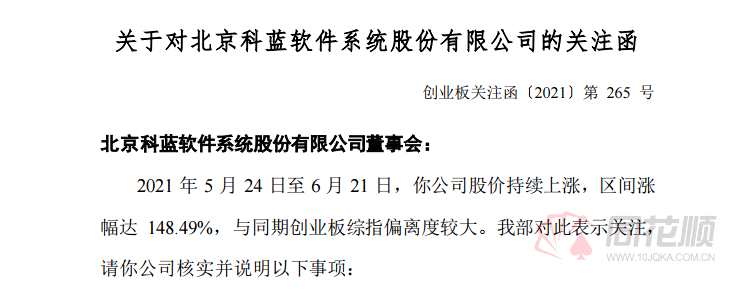 連續(xù)股價(jià)飆漲,交易所也坐不住了。昨日晚間,交易所對(duì)科藍(lán)軟件下發(fā)關(guān)注函,要求公司分析說(shuō)明基本面是否存在重大變化;是否存在應(yīng)披露未披露事項(xiàng);核查公司股價(jià)短期內(nèi)漲幅較大的原因等。