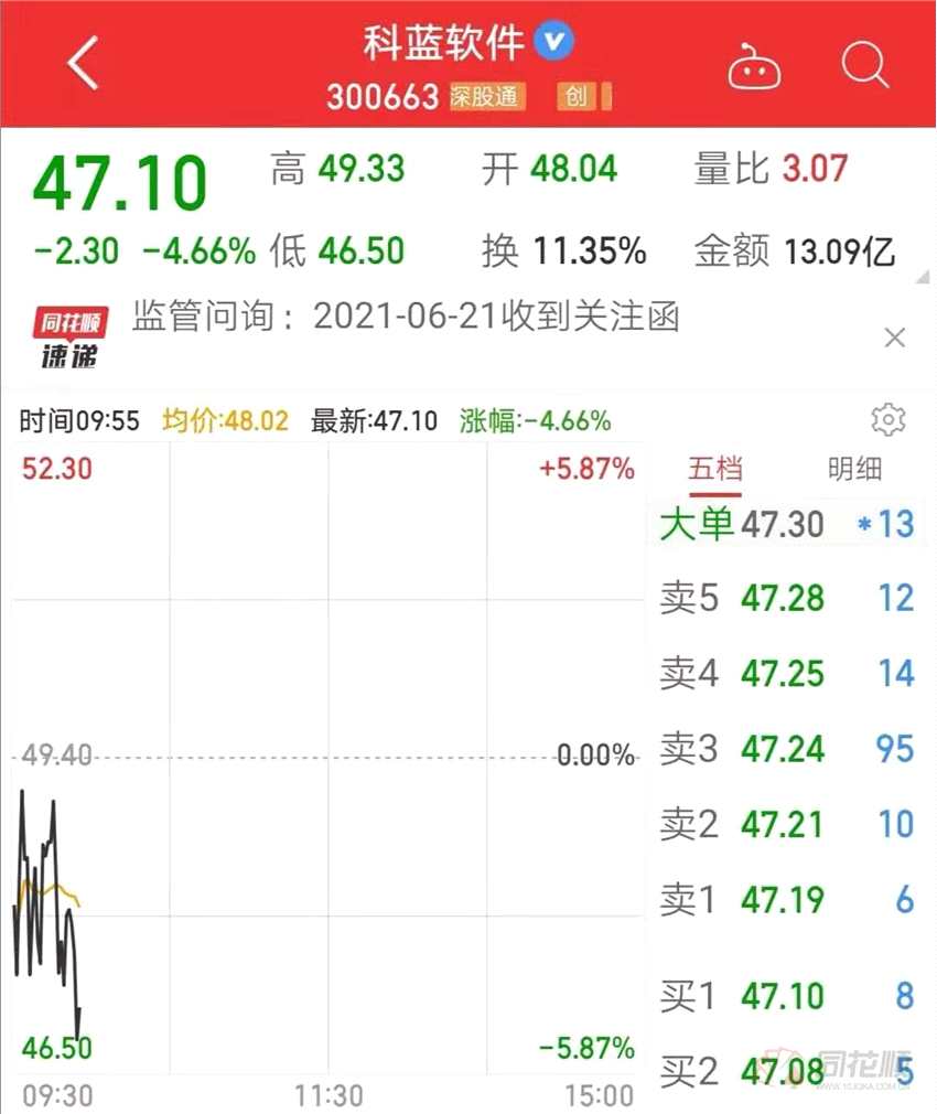 6月22日,科藍(lán)軟件(300663)低開(kāi)低走,截至發(fā)稿,跌4.66%,報(bào)47.10元/股。
