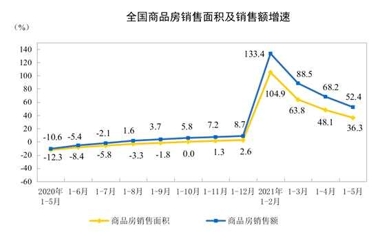 國(guó)家統(tǒng)計(jì)局近日公布的數(shù)據(jù)顯示,前5個(gè)月,我國(guó)商品房銷售面積約6.64億平方米,同比增長(zhǎng)36.3%,但增速較上月收窄11.8個(gè)百分點(diǎn);銷售額約7.05萬(wàn)億元,同比增長(zhǎng)52.4%,增速較上月收窄15.8個(gè)百分點(diǎn)。