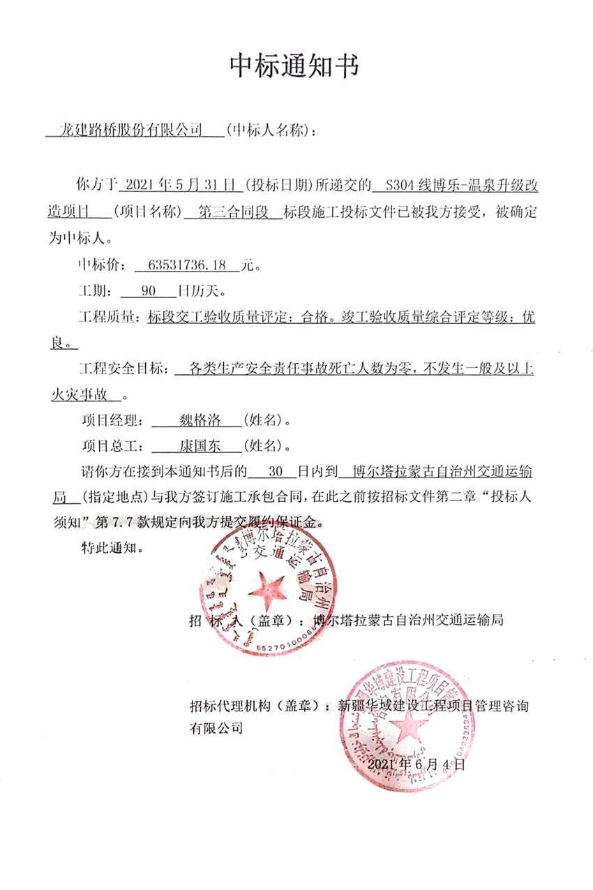 近日,收到來自新疆市場兩份中標(biāo)通知書。龍建品牌接連中標(biāo)第十師團(tuán)場城鎮(zhèn)基礎(chǔ)設(shè)施建設(shè)項(xiàng)目――城鎮(zhèn)道路工程項(xiàng)目與S304線博樂-溫泉升級改造項(xiàng)目。