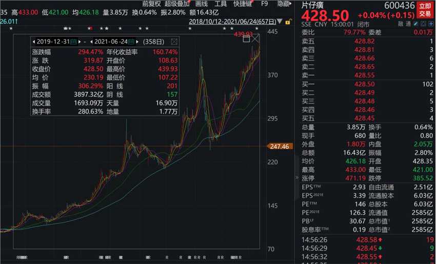 2020年年初,片仔癀股價(jià)還在100元左右,今年春節(jié)前,股價(jià)一度突破400元。春節(jié)之后,作為機(jī)構(gòu)重倉(cāng)股,股價(jià)也曾一度暴跌40%左右,但是又很快企穩(wěn)。尤其是限購(gòu)政策出臺(tái)之后,股價(jià)更是快速上漲,屢破新高,近日一度創(chuàng)新高至439元。
