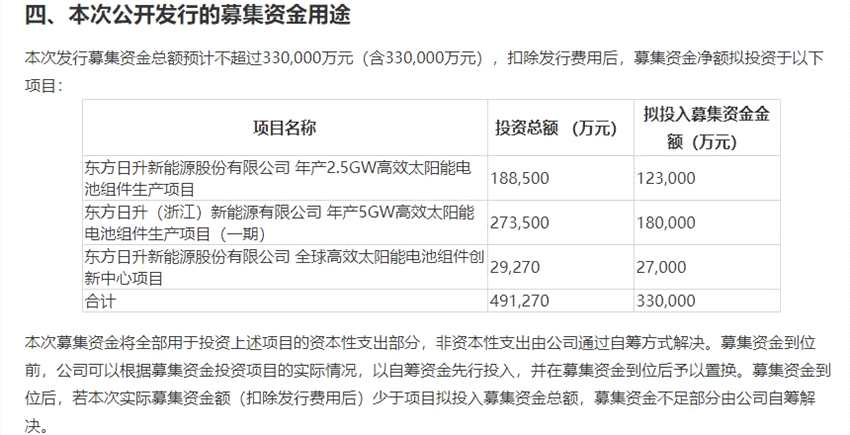 此前,2020年6月16日,東方日升發(fā)布《公開發(fā)行可轉換公司債券預案》,擬發(fā)行可轉換公司債券募集資金總額不超過人民幣33億元,擬用于年產(chǎn)2.5GW高效太陽能電池組件生產(chǎn)項目、年產(chǎn)5GW高效太陽能電池組件生產(chǎn)項目(一期)等。