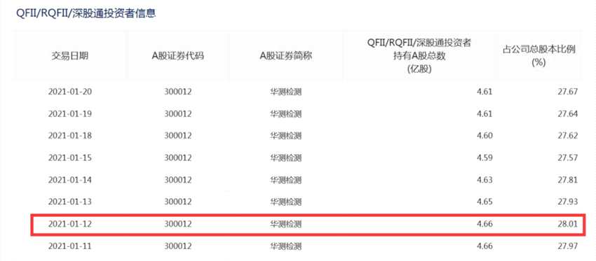 這是華測(cè)檢測(cè)外資持股比例首次突破26%,華測(cè)檢測(cè)也由此成為首個(gè)被外資買到超過(guò)26%持股比例的創(chuàng)業(yè)板個(gè)股。而在今年1月12日,華測(cè)檢測(cè)外資持股比例首次突破28%。