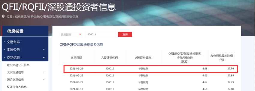 深交所最新披露數(shù)據(jù)顯示,截至6月23日,華測(cè)檢測(cè)QFII/RQFII/深股通投資者持有A股總數(shù)4.68億股,持股比例由27.89%升至27.99%,刷新階段新高,直逼28%的警戒線。