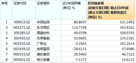 從二級(jí)市場(chǎng)表現(xiàn)來(lái)看,有1只股票過(guò)去一年股價(jià)漲幅超100%,有4只過(guò)去三年漲幅超200%,最高達(dá)到了521%。