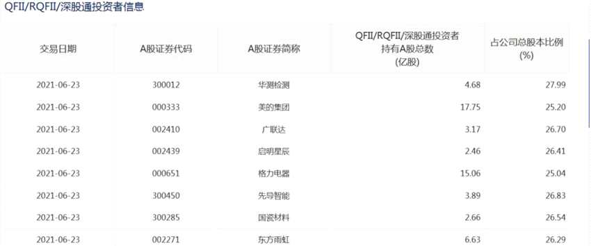 深交所最新數(shù)據(jù)顯示,截至2021年6月23日,6只股票的外資持股比例在26%以上,逼近“禁買線”。
