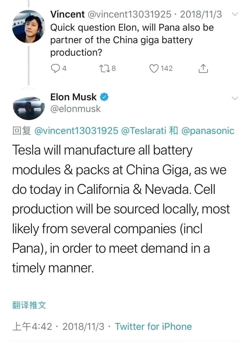 2018年11月,在確定了中國工廠已經(jīng)實(shí)質(zhì)性落地上海臨港(600848)之后,馬斯克通過twitter表示,中國工廠的電芯將由包括松下在內(nèi)的幾家公司本土化供應(yīng),為的是盡快實(shí)現(xiàn)投產(chǎn)。