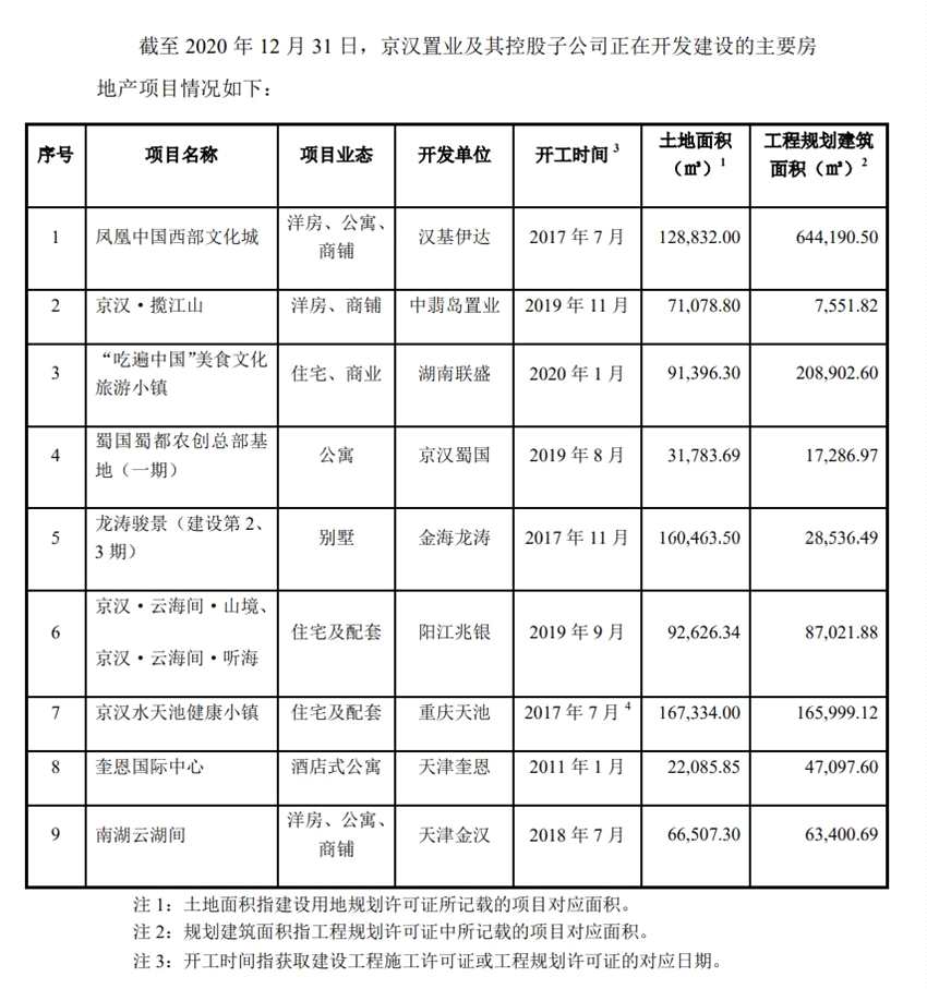 截至2020年12月31日,京漢置業(yè)及其控股子公司正在開發(fā)建設(shè)的主要房地產(chǎn)項目共有9個,包括鳳凰中國西部文化城、京漢·攬江山、“吃遍中國”美食文化旅游小鎮(zhèn)、蜀國蜀都農(nóng)創(chuàng)總部基地(一期)、龍濤駿景(建設(shè)第2、3期)、京漢·云海間·山境、京漢·云海間·聽海、京漢水天池健康小鎮(zhèn)、奎恩國際中心、南湖云湖間,項目業(yè)態(tài)包括住宅、公寓、別墅、洋房、商業(yè)等。