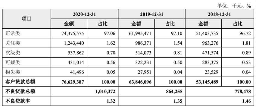 從資產(chǎn)質(zhì)量的角度看,截至2018-2020年末,瑞豐銀行不良貸款率分別為1.46%、1.35%、1.32%,逐年下降。去年末,該行不良貸款余額為10.10億元。