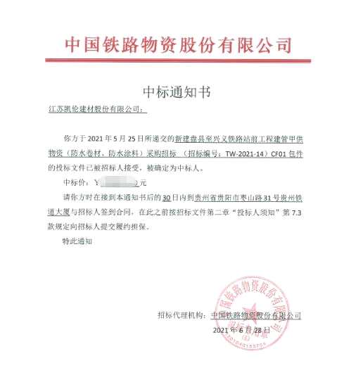導(dǎo)讀:近日,成新建盤縣至興義鐵路站前工程建管甲供物資(防水卷材、防水涂料)采購招標(biāo)信息已完成公示,【凱倫股份(300715)、股吧】(300715)從眾多競標(biāo)單位中脫穎而出,光榮中標(biāo)。