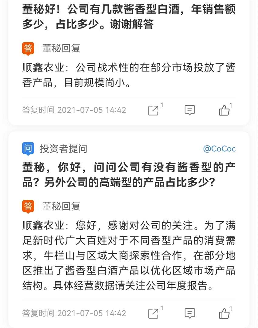 順鑫農(nóng)業(yè)董秘回復(fù)稱,為了滿足新時代廣大百姓對于不同香型產(chǎn)品的消費(fèi)需求,牛欄山與區(qū)域大商探索性合作,在部分地區(qū)推出了醬香型白酒產(chǎn)品以優(yōu)化區(qū)域市場產(chǎn)品結(jié)構(gòu),目前規(guī)模較小。