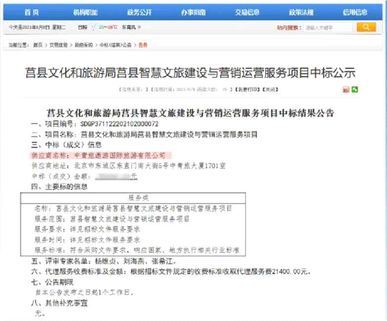 近日,日照市公共資源交易網(wǎng)對外發(fā)布公告,【中青旅(600138)、股吧】(600138)旗下中青旅遨游國際旅游有限公司(下文簡稱:中青旅遨游)中標(biāo)“莒縣智慧文旅建設(shè)與營銷運(yùn)營服務(wù)項目”。