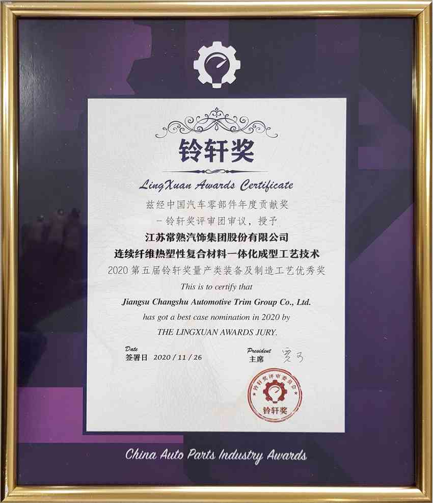 11月26日至27日,第五屆鈴軒獎(jiǎng)典禮暨中國(guó)汽車(chē)供應(yīng)鏈峰會(huì)在武漢隆重舉行。超過(guò)100家零部件企業(yè)和145個(gè)優(yōu)秀產(chǎn)品或技術(shù)案例經(jīng)過(guò)了評(píng)審團(tuán)四輪嚴(yán)格的評(píng)審,江蘇【常熟汽飾(603035)、股吧】(603035)集團(tuán)股份有限公司的“連續(xù)纖維熱塑性復(fù)合材料一體化成型工藝技術(shù)”榮獲“量產(chǎn)類(lèi)裝備及制造工藝優(yōu)秀獎(jiǎng)”,代表了對(duì)公司研發(fā)和產(chǎn)品化實(shí)力的極大認(rèn)可。同時(shí)公司獲頒本屆鈴軒獎(jiǎng)特設(shè)的“守望互助獎(jiǎng)”,以表彰公司在2020抗疫特殊時(shí)期為復(fù)工復(fù)產(chǎn)和保證零件供應(yīng)所做的工作。