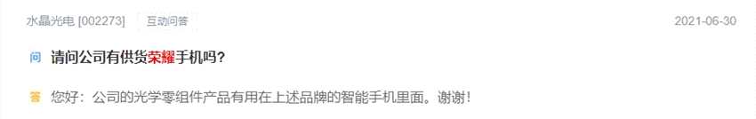 6月30日,水晶光電表示,公司的光學(xué)零組件產(chǎn)品用于榮耀品牌智能手機。