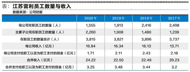 江蘇雷利所有子公司在職員工的數(shù)量從2017年的1239人大增至2020年的2260人,增加上千人,而營業(yè)收入從6.52億元增加至7.38億元,增加不足億元,人均營業(yè)收入更是從52.62萬元大幅減少至32.66萬元。