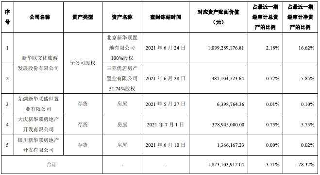2021年7月9日,新華聯(lián)(000620.SZ)公告稱,公司及子公司存在新增資產(chǎn)被查封、凍結(jié)的情況。其中,新華聯(lián)持有的北京新華聯(lián)置地有限公司100%股權(quán)、三亞優(yōu)居房產(chǎn)置業(yè)有限公司51.74%股權(quán),分別于6月24日、28日被查封,對(duì)應(yīng)的資產(chǎn)賬面價(jià)值分別為11億元、3.87億元。蕪湖新華聯(lián)盛世置業(yè)有限公司、大慶新華聯(lián)房地產(chǎn)開發(fā)有限公司、銀川新華聯(lián)房地產(chǎn)開發(fā)有限公司房屋資產(chǎn)被凍結(jié)。