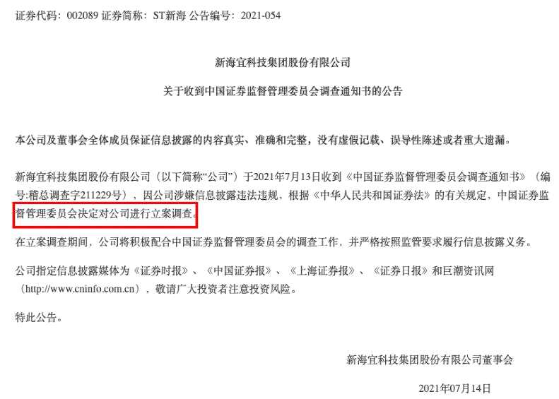 昨晚,ST新海發(fā)布公告顯示,公司于2021年7月13日收到《中國(guó)證券監(jiān)督管理委員會(huì)調(diào)查通知書》(編號(hào):稽總調(diào)查字211229號(hào)),因公司涉嫌信息披露違法違規(guī),根據(jù)《中華人民共和國(guó)證券法》的有關(guān)規(guī)定,中國(guó)證券監(jiān)督管理委員會(huì)決定對(duì)公司進(jìn)行立案調(diào)查。