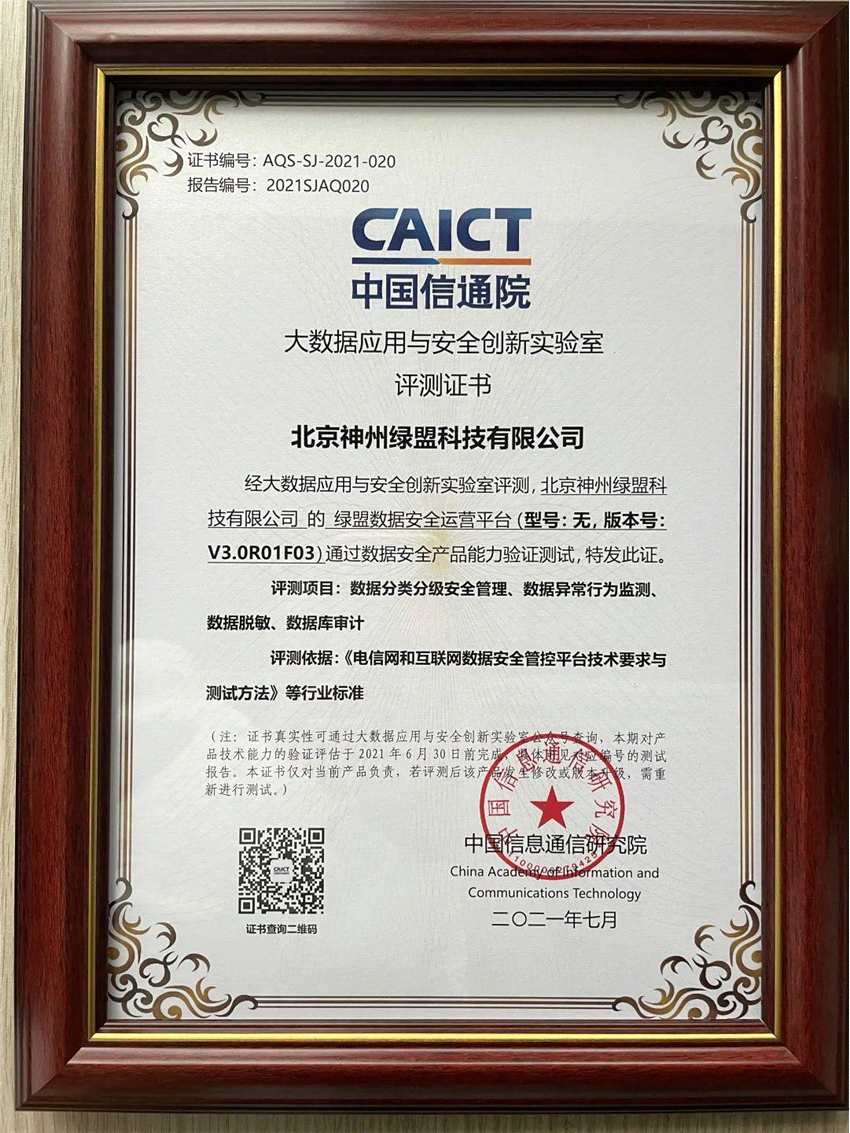 7月14日,中國信息通信研究院(以下簡稱“中國信通院”)頒發(fā)“卓信大數據計劃”-數據安全類產品能力驗證測試證書。綠盟數據安全運營平臺順利通過數據分類分級安全管理、數據異常行為監(jiān)測、數據脫敏、數據庫審計四項功能評測,獲得評測證書。