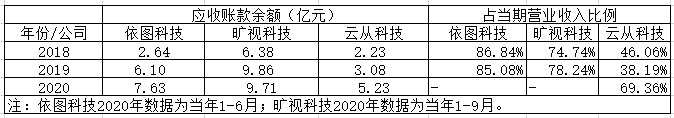 在應(yīng)收賬款的對(duì)比上,三家公司均存在較大額的應(yīng)收賬款,云從科技應(yīng)收賬款占當(dāng)期營(yíng)業(yè)收入比例較低。