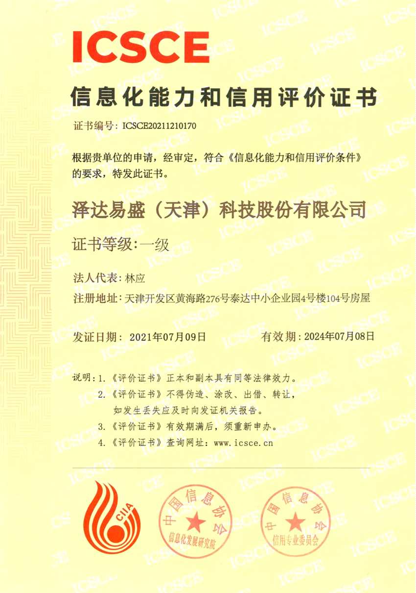 近日,【澤達(dá)易盛(688555)、股吧】獲得由中國信息協(xié)會信息化發(fā)展研究院、信用專業(yè)委員會頒發(fā)的信息化能力和信用評價(jià)一級證書。信息化能力和信用評價(jià)等級分為一級、二級、三級和四級四個等級,其中一級為最高等級。