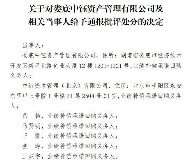 7月15日,深交所公布一則紀(jì)律處分顯示,在【金字火腿(002515)、股吧】(002515)處置所持股權(quán)事項(xiàng)中,婁底中鈺資產(chǎn)管理有限公司(以下簡(jiǎn)稱“婁底中鈺”)、中鈺資本管理(北京)有限公司(以下簡(jiǎn)稱“中鈺資本”)、禹勃、馬賢明等業(yè)績(jī)承諾回購(gòu)人因多次未能履行其承諾而被通報(bào)批評(píng)。