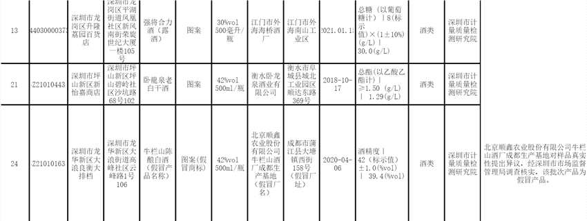 抽檢于深圳市龍華新區(qū)大浪良衡大排檔的北京順鑫農(nóng)業(yè)(000860)股份有限公司牛欄山酒廠成都生產(chǎn)基地(假冒廠名)生產(chǎn)的牛欄山陳釀白酒(假冒產(chǎn)品名稱)酒精度不合格,標(biāo)示值為42±1.0%vol,檢驗(yàn)結(jié)果為39.4%vol。深圳市市場(chǎng)監(jiān)管局稱,北京順鑫農(nóng)業(yè)股份有限公司牛欄山酒廠成都生產(chǎn)基地對(duì)樣品真實(shí)性提出異議,經(jīng)深圳市市場(chǎng)監(jiān)督管理局調(diào)查核實(shí),該批次產(chǎn)品為假冒產(chǎn)品。