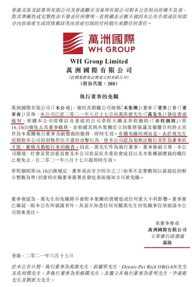 公告稱(chēng),萬(wàn)洲國(guó)際認(rèn)為他無(wú)法履行其作為董事的才能、審慎及勤勉行事的職責(zé)。公告顯示,6月17日起,萬(wàn)洪建作為執(zhí)行董事、董事會(huì)副主席、萬(wàn)洲國(guó)際環(huán)境、社會(huì)及管治委員會(huì)及食品安全委員會(huì)成員以及集團(tuán)副總裁的職務(wù)已被免去。