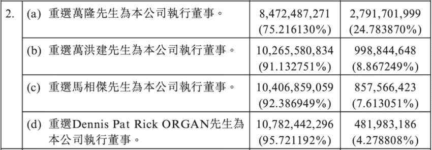 在此前的6月1日,萬(wàn)洲國(guó)際股東大會(huì)上,萬(wàn)洪建再次當(dāng)選為執(zhí)行董事,贊成票比例為91%。萬(wàn)隆的得票率只有75%。